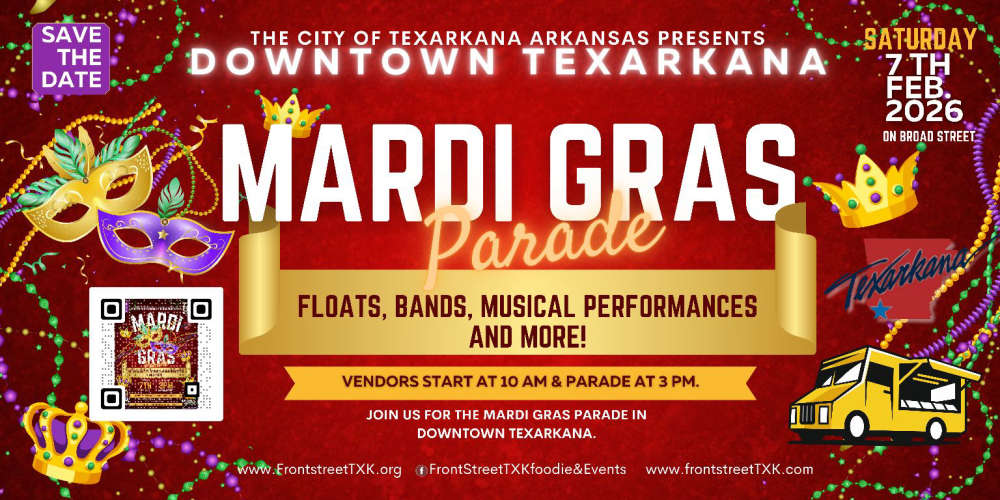 Mardi Gras 2026 Set for All-Day Celebration in Downtown TexarkanaThe annual Mardi Gras celebration will take place on Saturday in downtown Texarkana.